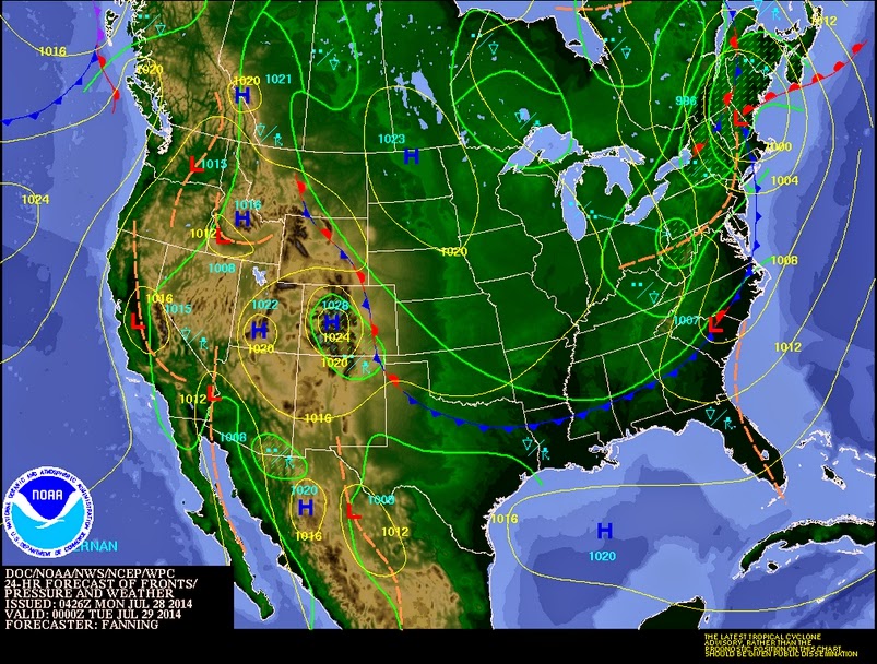 made at 8 am EDT Monday July 28, 2014 using data from the Meteosat-9 satellite. Dry, dusty air was present from the coast of Africa westwards across the tropical Atlantic, but was located well to the north of tropical disturbance 93L